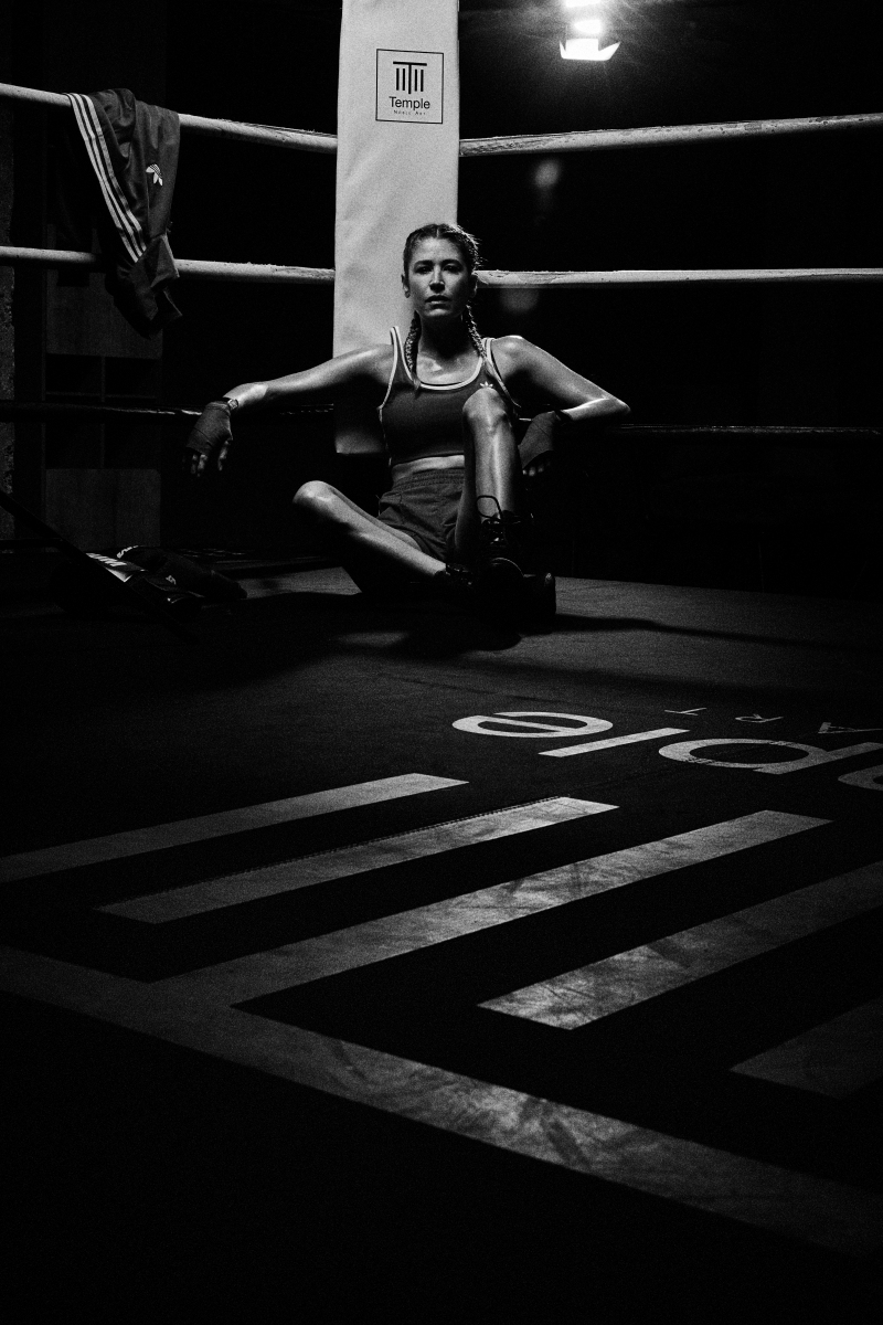 Stepping into the boxing gym, I was drawn to the contrast: bright overhead training lights fading into pockets of darkness around the ring. That tension between visibility and shadow, power and pause became the foundation for this portrait.